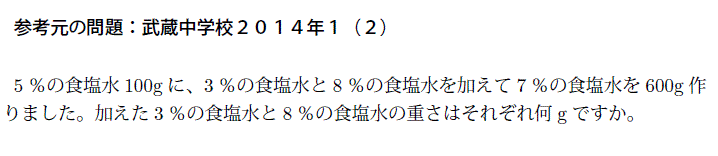 4問目です。参考元は武蔵中学校2014年1(2)です。100gあたりの食塩の量に着目して解いていく部分と、2種類をまぜてその間にある濃度にするための比率について考える部分があるので選びました。次に追加するものもこういったタイプにします。