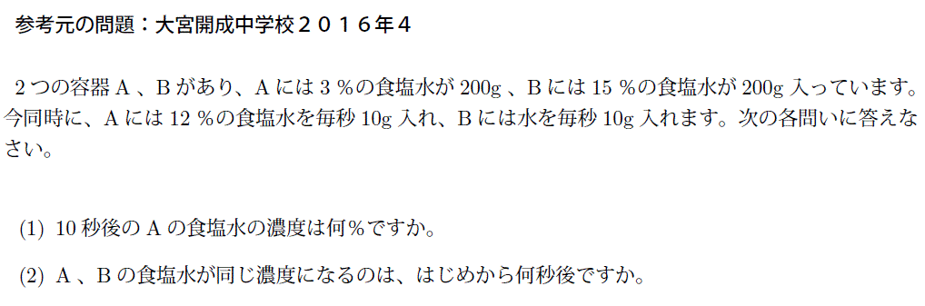 参考元の数値変更に加えて、含まれる食塩が一定のまま全体の重さが増えていくパターンをアレンジとして加えました。やり方などは書きませんでしたが、食塩が一定で濃度が一定ってそれはつまり、といった感じで同じように考えてみてください。上記2種類とも、濃度というよりは速さの問題の、旅人算の応用といえると思います。