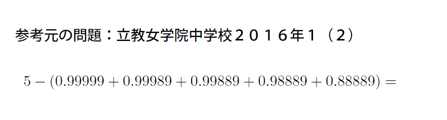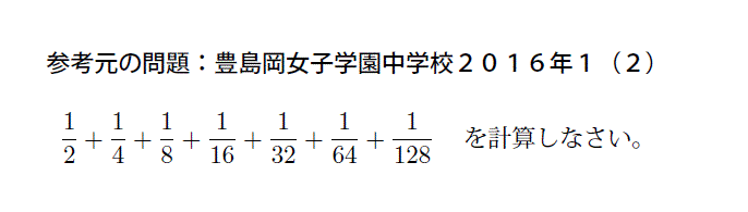 足し算の計算の工夫を追加しました。参考元は豊島岡女子学園2016問1(2)です。同じ年で、ほかにもいくつかこの題材を出しているようですから、毎年どこかで出る話なのかなと思います。